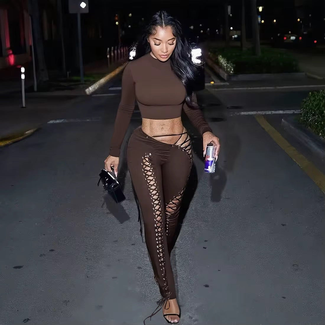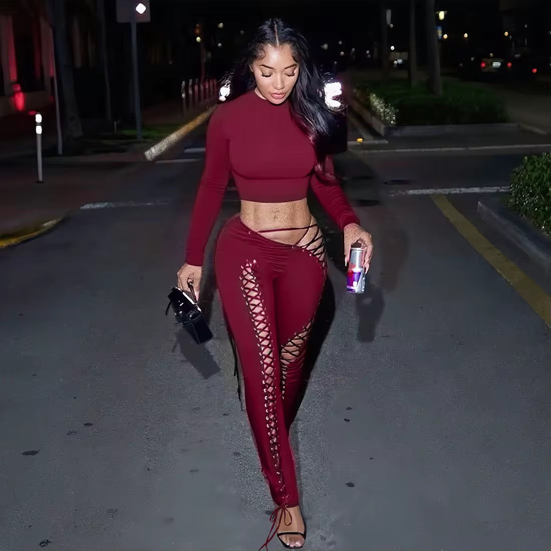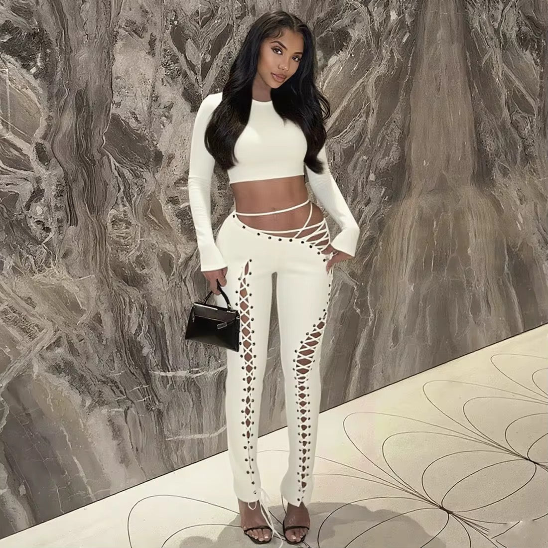 Elevate your wardrobe with our Caught Up In You Two Piece Tie Up Pants Set. The tie up pants and detailed strings add unique flair while the crop bralette halter top provides a flattering fit. Perfect for making a statement and showing off your individual baddie style