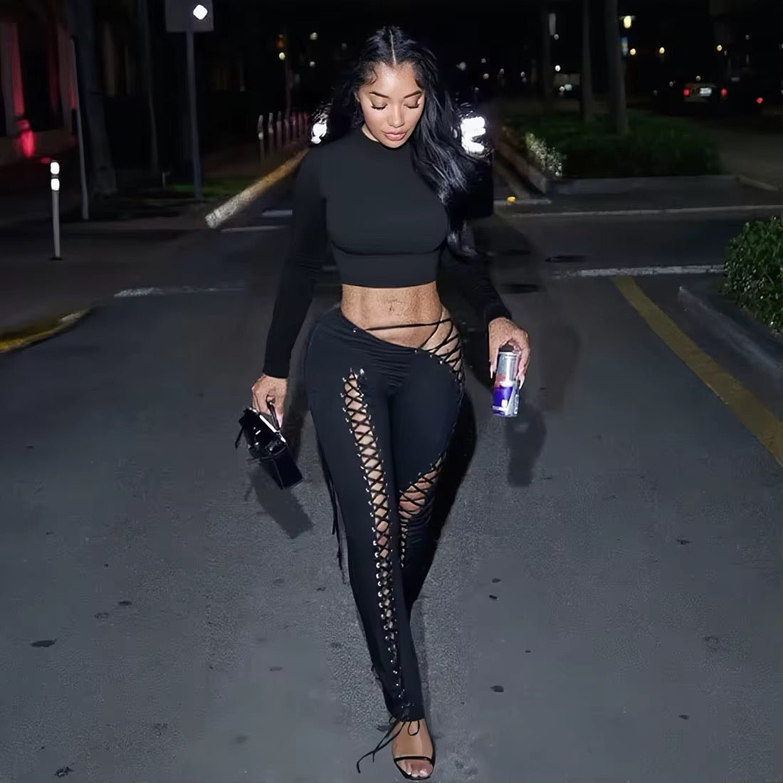 Caught Up In You Two Piece Tie Up Pants Set - Long Sleeve (BLACK)