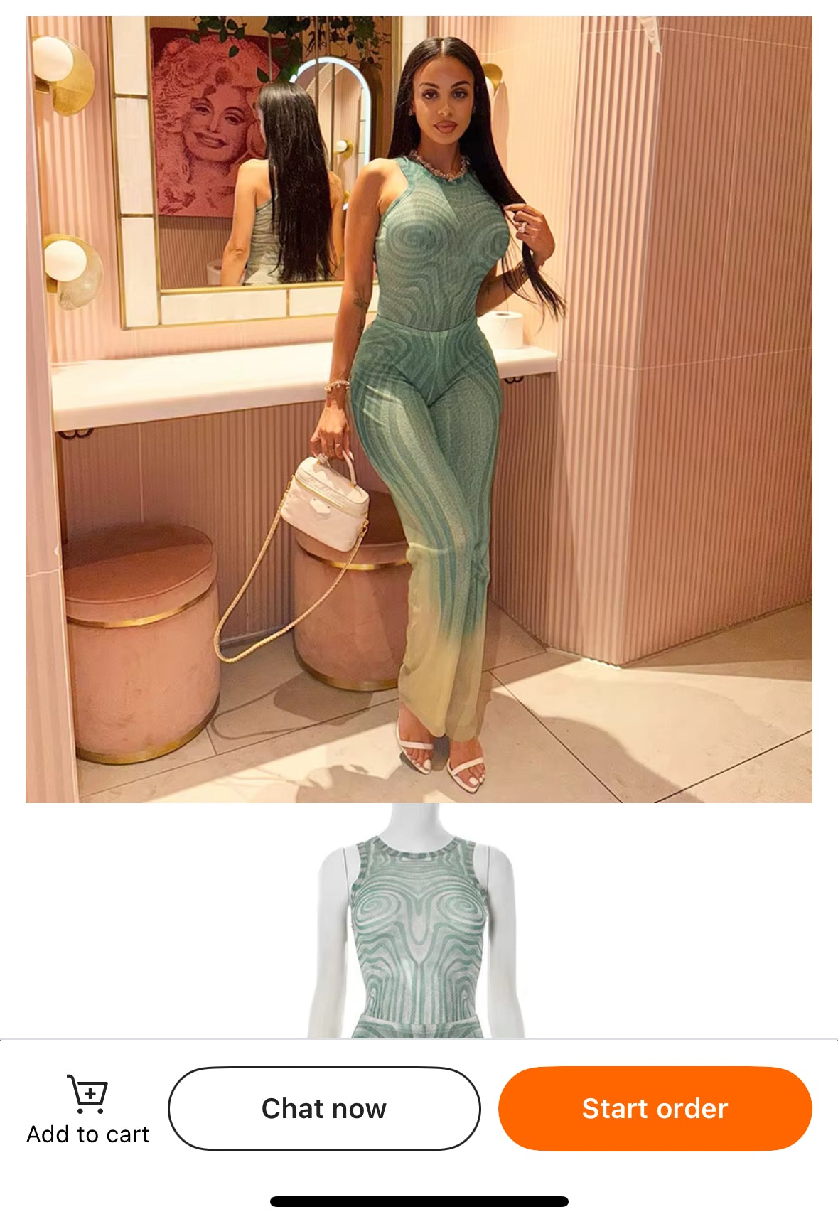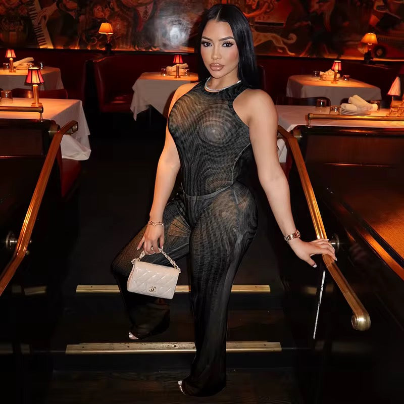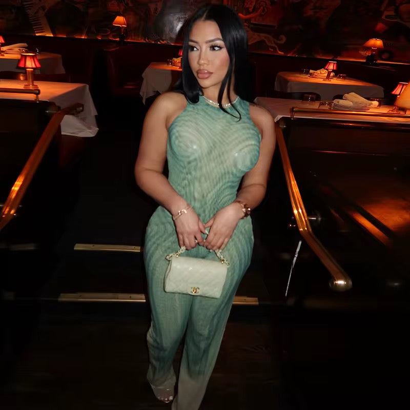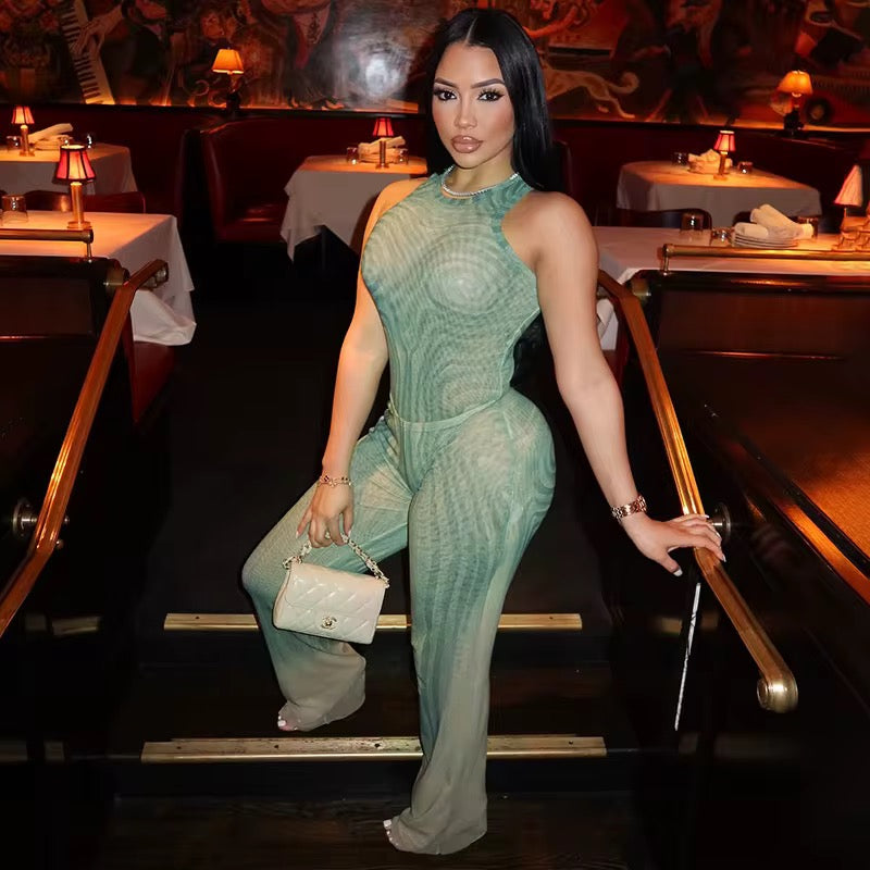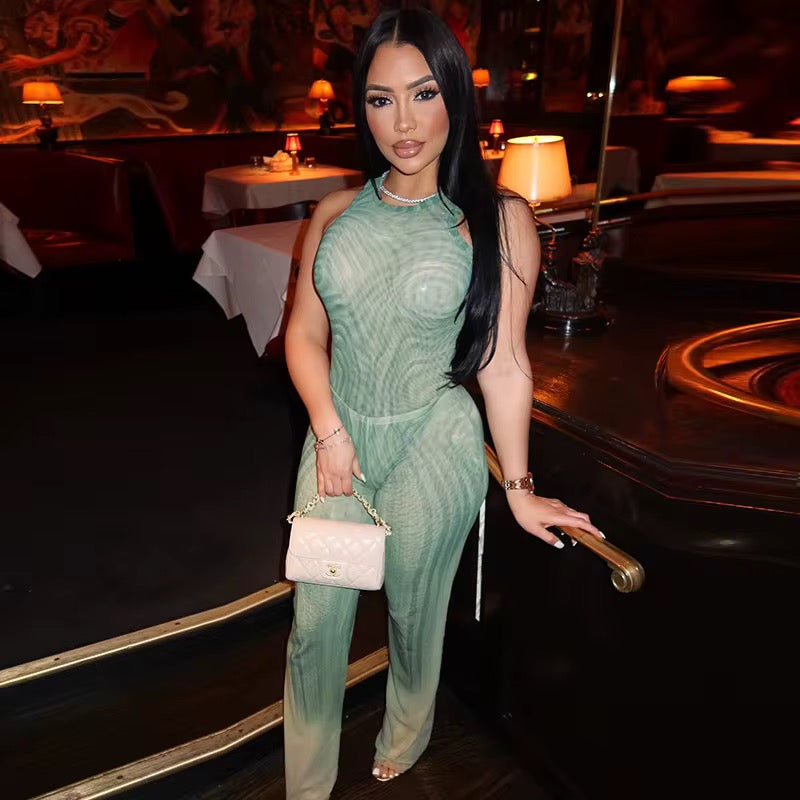 Take your style to new heights with the Euphoria Swirl Print Two Piece Bodysuit Set. The sleek fabric and body-sculpting fit effortlessly elevate your fashion game. This set features a bodysuit and pants, both in a trendy sleeveless design. With a mint and nude swirl pattern, this set adds a touch of high fashion fantasy to your wardrobe