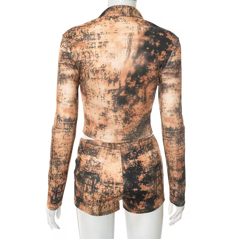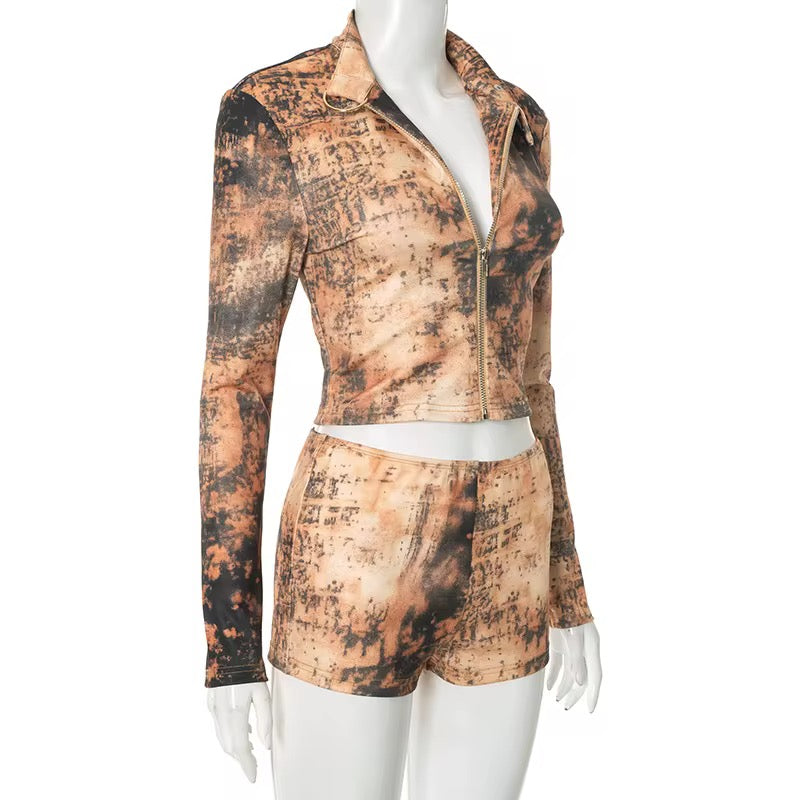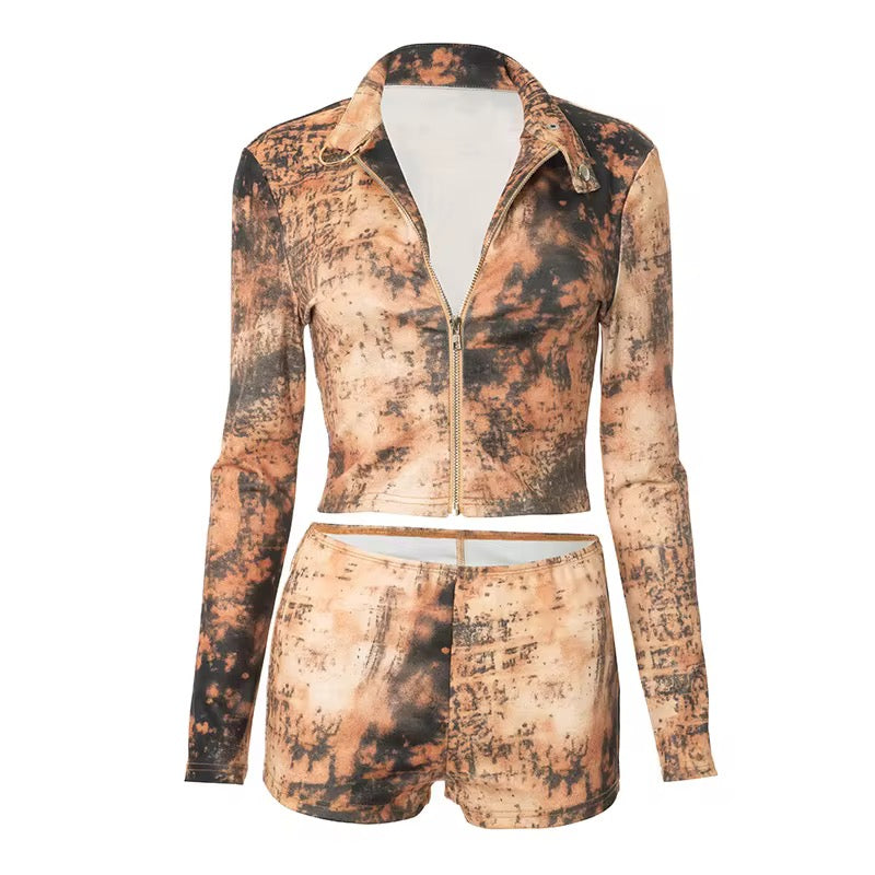 Be the envy of everyone in this Most Wanted Two Piece Shorts Set. Featuring a trendy zipper crop top and matching shorts, all in a stylish brown nude print. Perfect for a day out with friends or a night out on the town. Get ready to stand out in this set